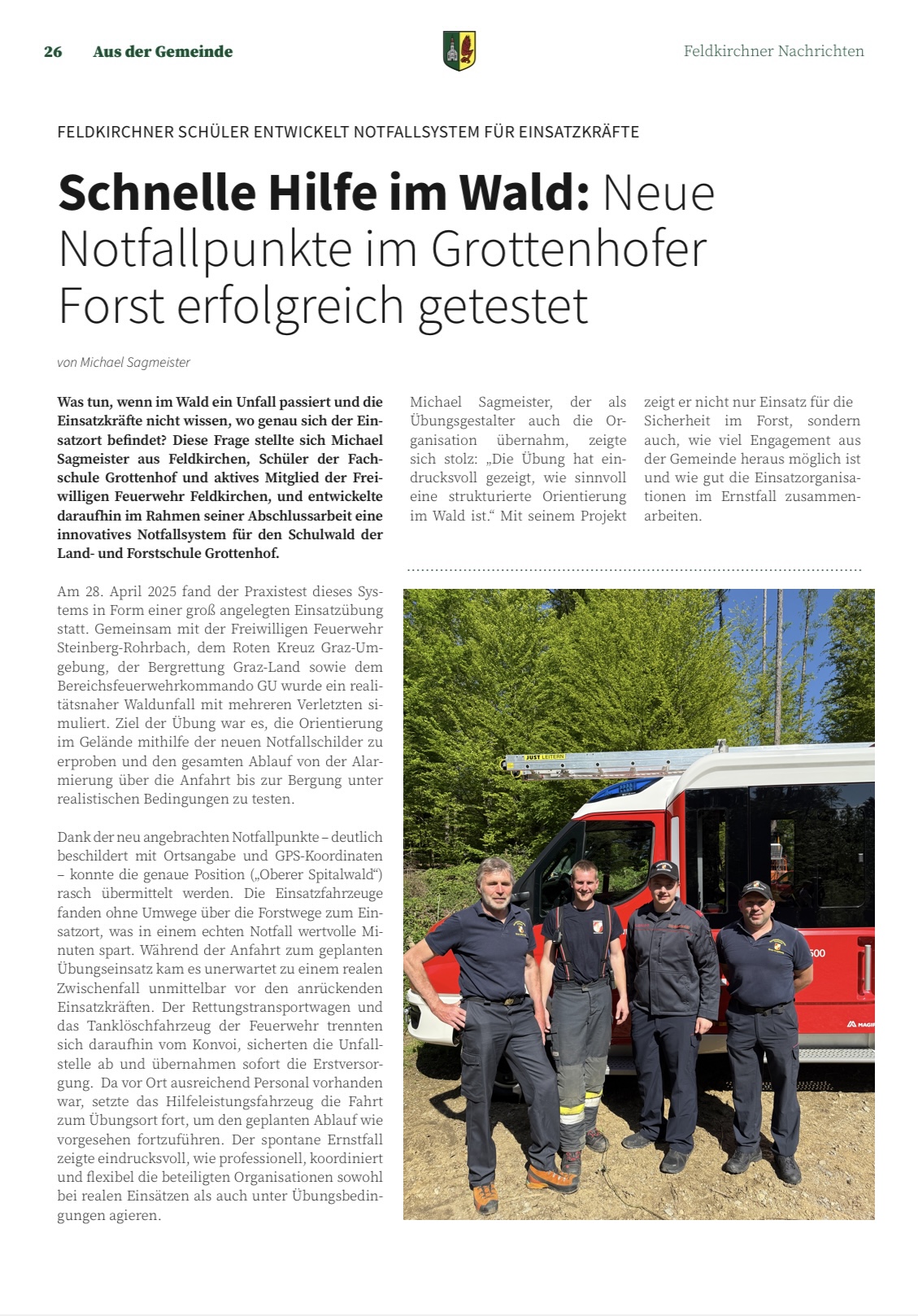 Die Notfallpunkte wurden im Rahmen einer Abschlussarbeit von Michael Sagmeister, Schüler der Fachschule Grottenhof und aktives Mitglied der Freiwilligen Feuerwehr Feldkirchen, im Jahr 2025 umgesetzt.