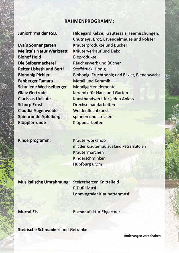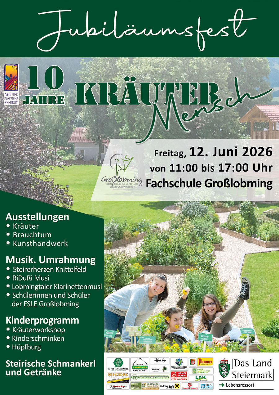 gilt den Initiatoren unseres Kräuter-Kompetenzzentrums. Dies sind die Gemeinde Lobmingtal, die Obersteirische Molkerei Lagerhaus & Co. KG, die Raiffeisenbank Aichfeld eGen, die Brauerei Murau eGen, die Gall-Pharma GmbH sowie die Fachschule für Land- und Ernährungswirtschaft Großlobming.