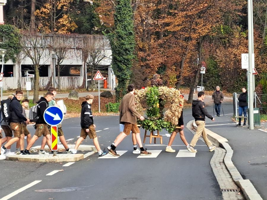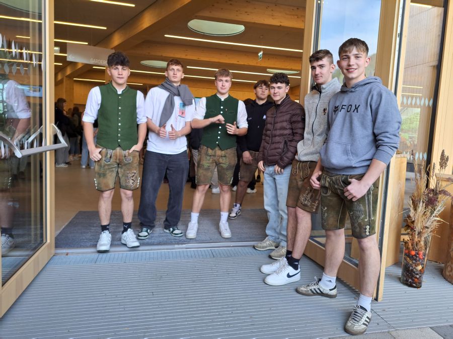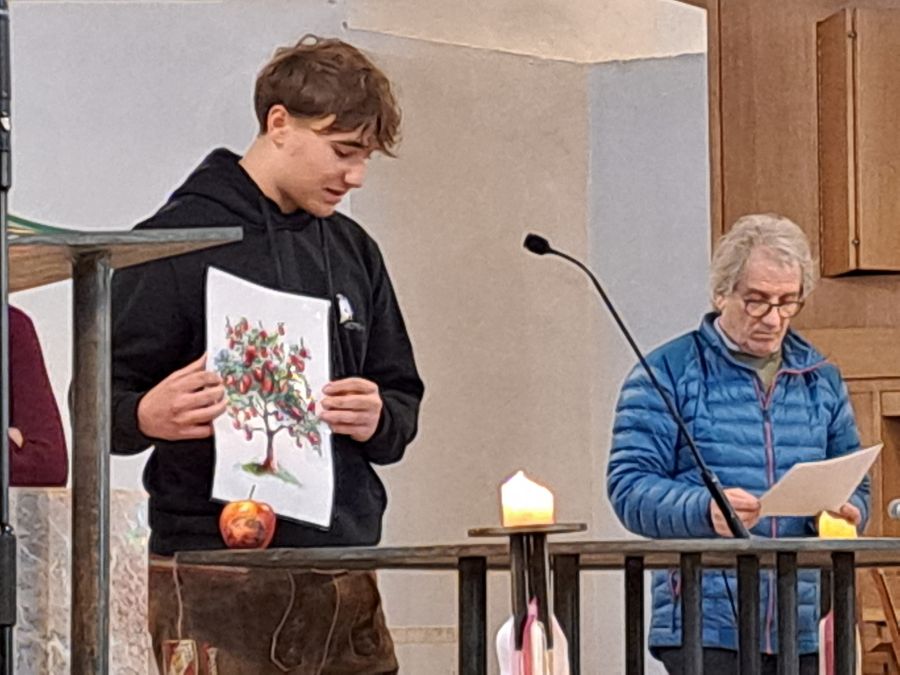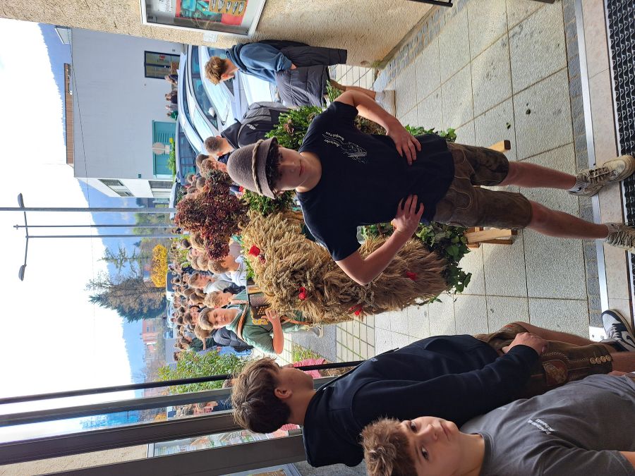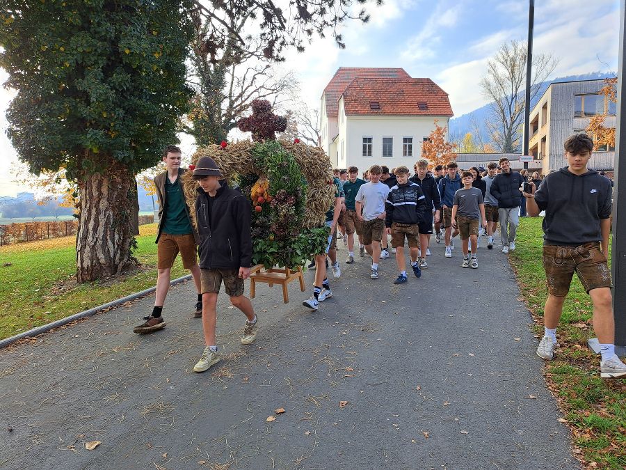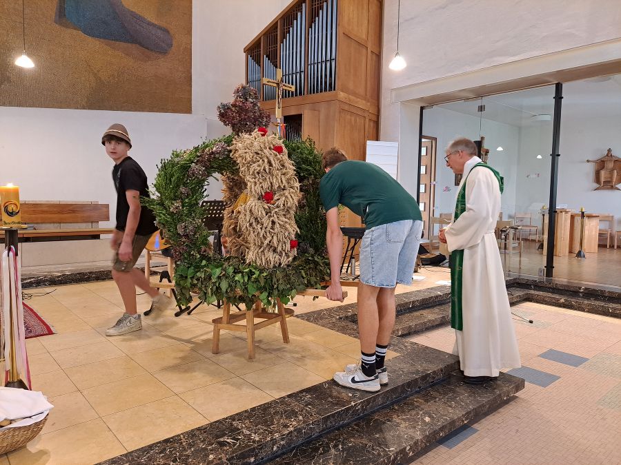 Die Schüler haben gemeinsam im Praxisunterricht eine Erntekrone gebunden. Diese wurde dann in die Kirche getragen - begleitet von Harmonikamusik und natürlich den Schülern, Lehrern und auch dem Betriebspersonal.